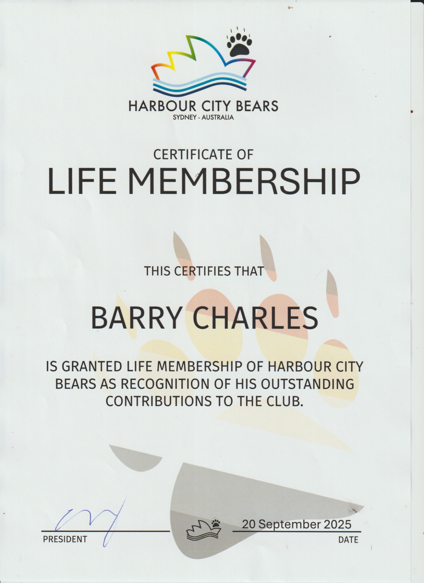 L.M.: At the recent Harbour City Bears Annual General Meeting on Saturday, 20th September 2025, you received the Certificate of Life Membership for your outstanding contributions to the HCB club. Congratulations. What does getting the certificate mean to you?