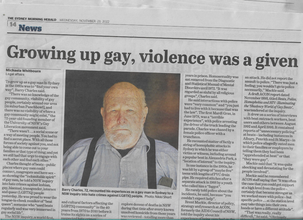 - Sydney Morning Herald: https://www.smh.com.au/national/nsw/you-had-to-find-a-secret-place-growing-up-gay-in-a-violent-sydney-shadow-world-20221122-p5c07q.html